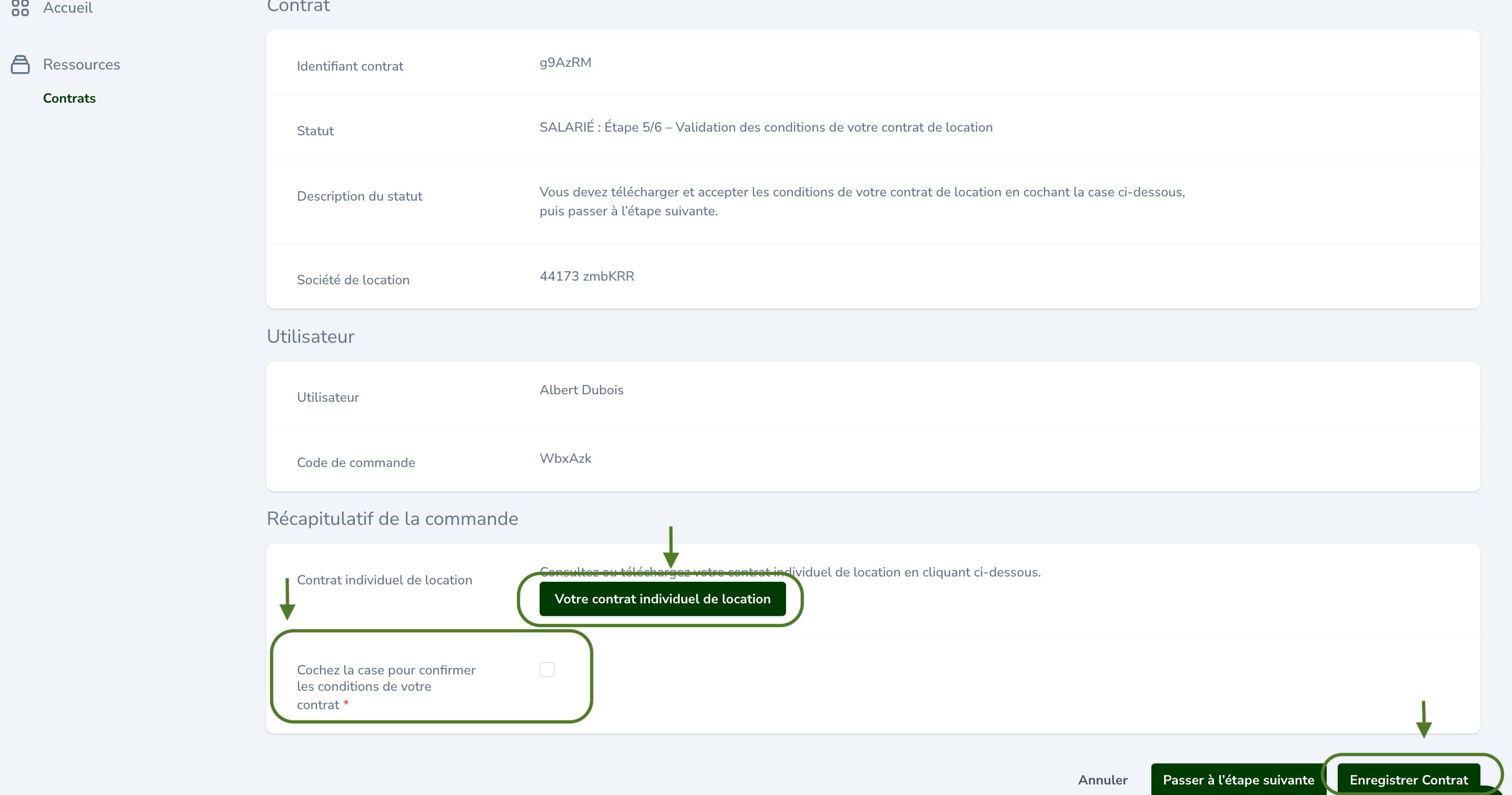 - Téléchargez et consultez votre contrat de location, puis acceptez ses conditions en cochant la case « Confirmer les conditions de votre contrat ». Cliquez ensuite sur « Enregistrer le contrat » pour finaliser la validation.