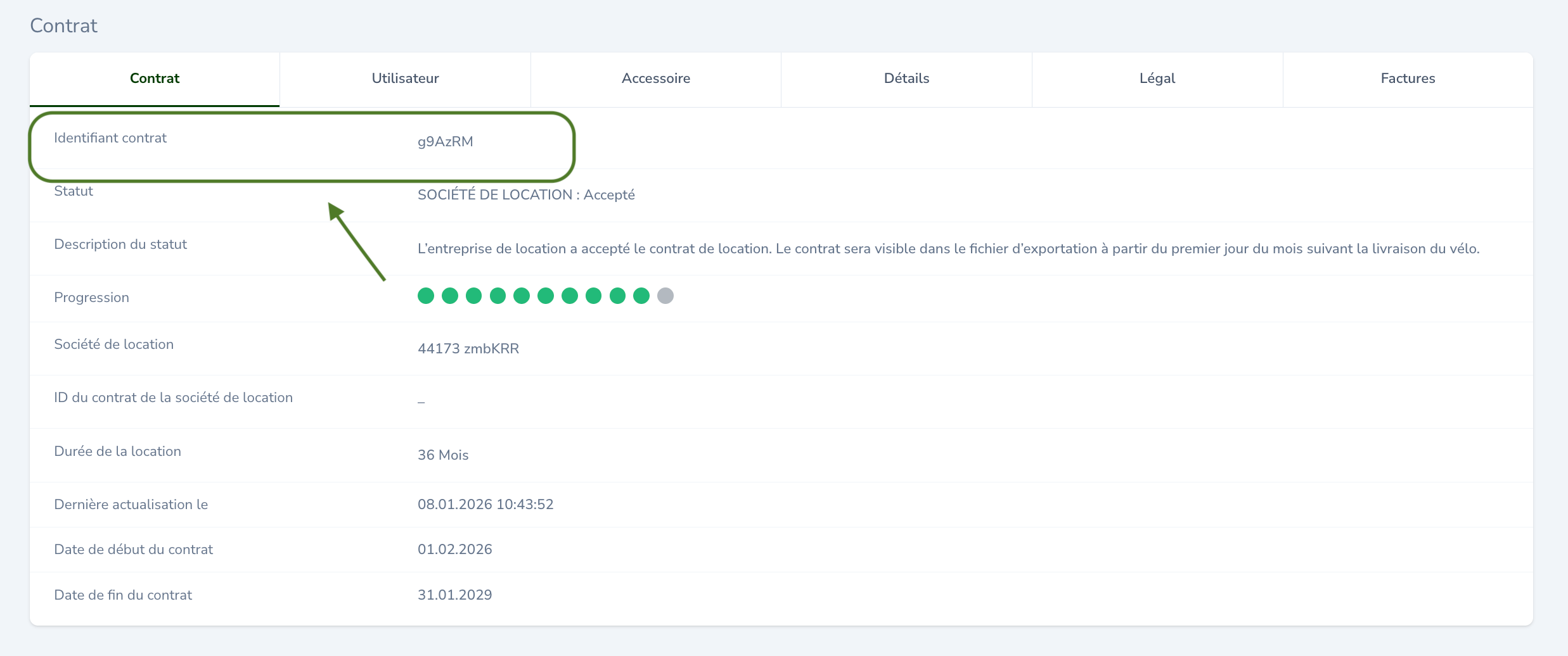 Cliquez sur l’icône 👁️ du contrat que vous voulez consulter. Le numéro du contrat se trouve dans la colonne « Identifiant »